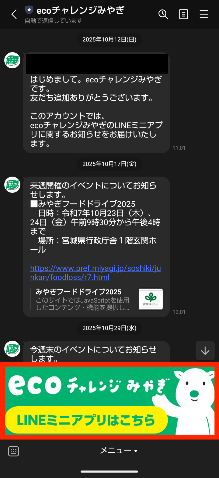 ※赤枠のバナーが出てこない場合は、「メニュー」をタップ