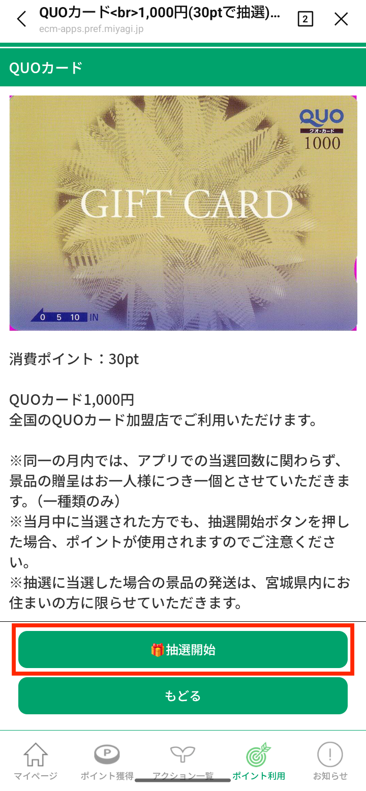 遷移後の画面で消化ポイントや利用可能店舗などを御確認の上「抽選開始」をタップしてください。